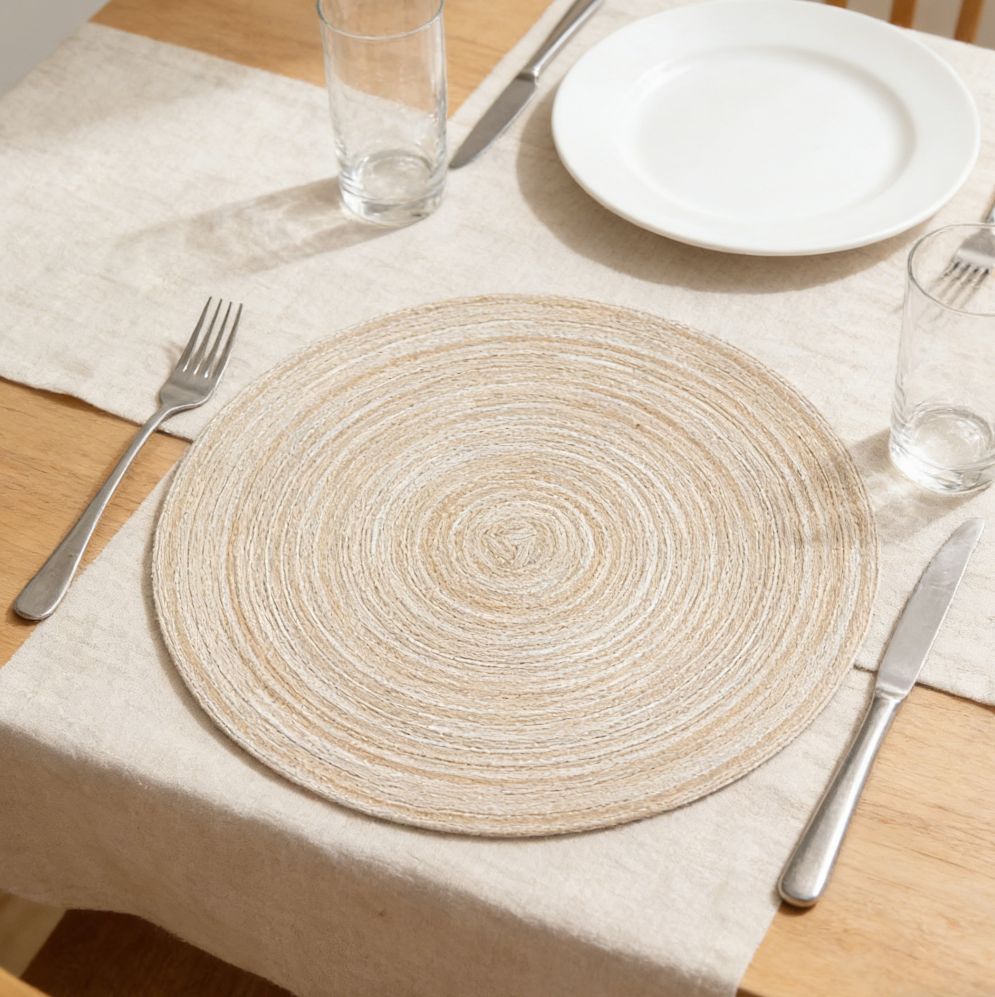 This four-piece placemat set offers 15-inch round braided mats crafted from natural fibers, bringing a farmhouse-inspired texture to dining tables. The woven construction allows for subtle airflow, heat resistance, and surface protection for plates and serving dishes.